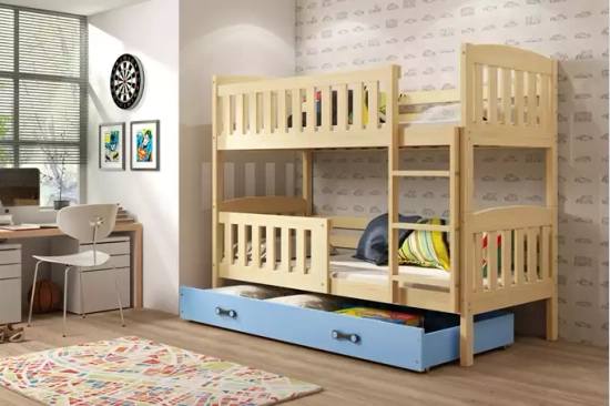 Pat supraetajat Jacquot 90x190 cu saltea și sertar, pin/albastru