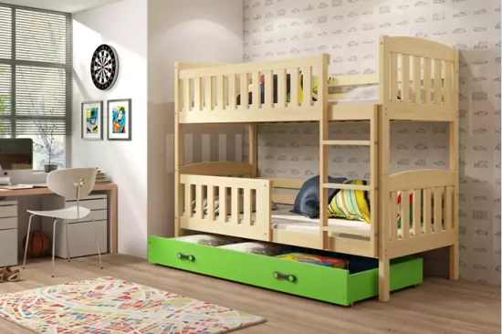 Pat supraetajat Jacquot 90x190 cu saltea și sertar, pin/verde