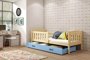 KUBUŚ 90X200 pat single pentru tineri cu saltea și sertar, pin/albastru