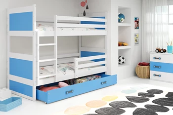 Pat supraetajat pentru tineret RICO 90X200 cu sertar, alb/albastru