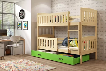 Pat supraetajat junior KUBUŚ 90X200 cu saltea și sertar, pin/verde