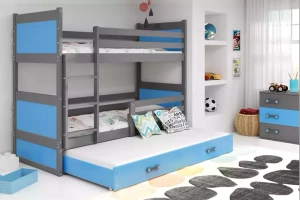 Pat supraetajat pentru adolescenți Rico cu 3 locuri 90x190 cu sertar, gri/albastru