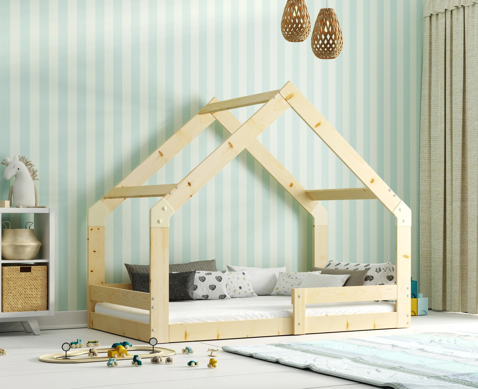 Balustrada de siguranță, asigură siguranța și cadrul din lemn susține dezvoltarea sănătoasă a coloanei vertebrale. Dimensiunea de 80x160 cm este potrivită pentru copiii cu vârste cuprinse între 3 și 10 ani. Patul de casă din lemn natural combină estetica, confortul și funcționalitatea pentru a deveni un decor unic pentru camera unui copil.