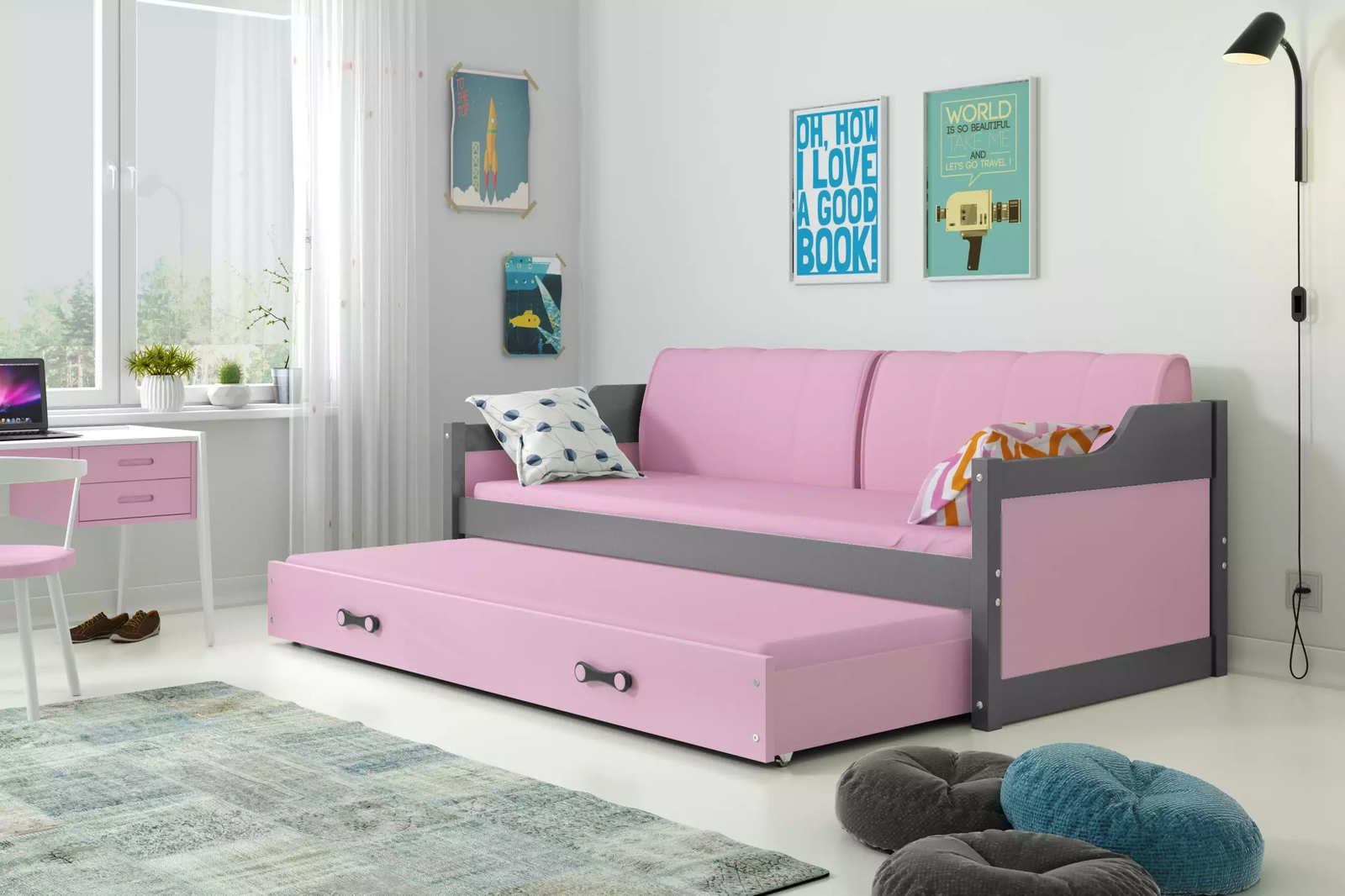 DAWID 90X200 pat extensibil pentru tineri cu saltea și sertar, grafit/roz