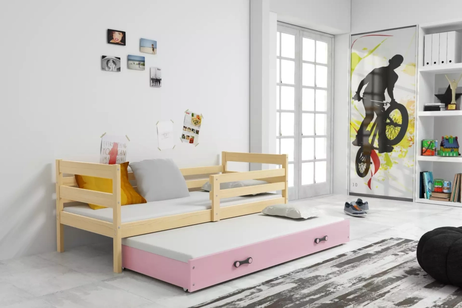 Éric 90x190 pat trundle pentru adolescenți cu saltea și sertar, pin/roz