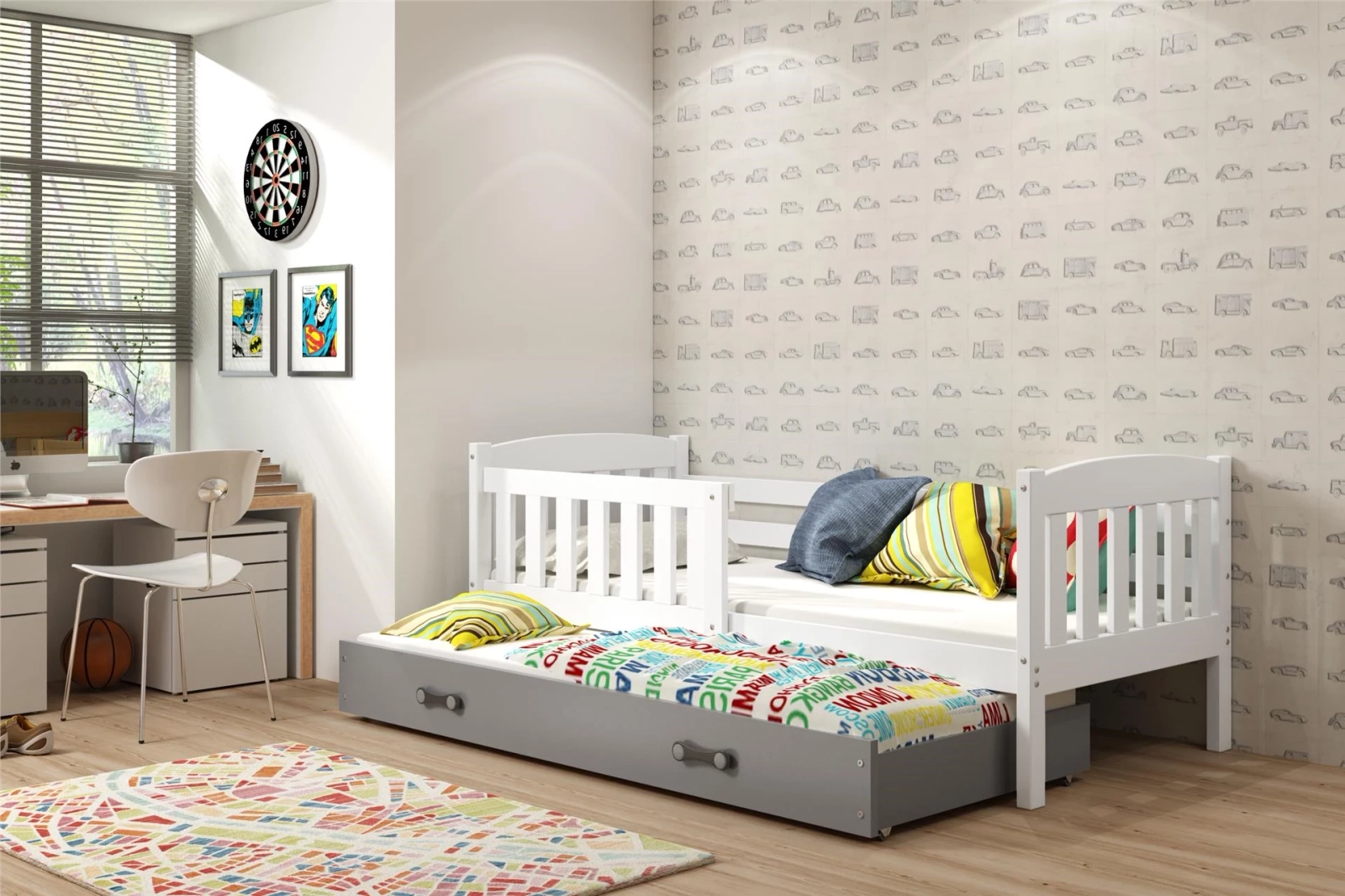 Jacquot 90x190 pat trundle adolescent cu saltea și sertar, alb/gri