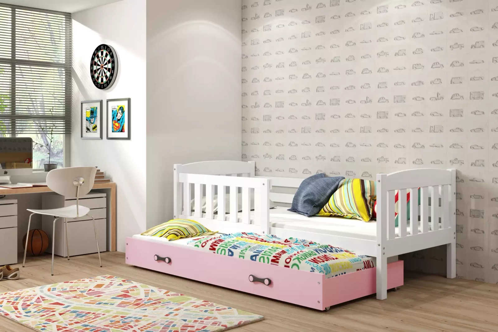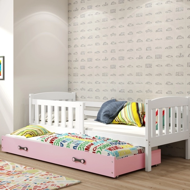 Jacquot 90x190 pat trundle adolescent cu saltea și sertar, alb / roz
