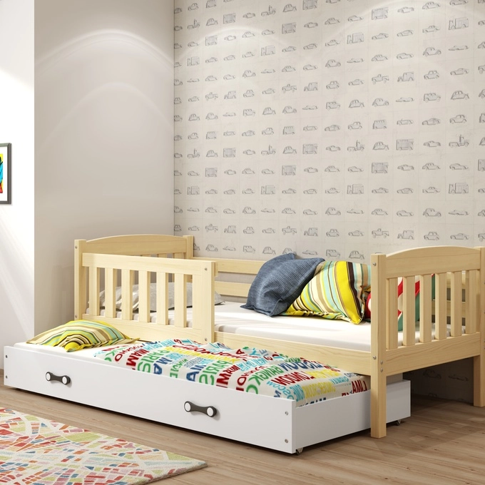 Stabilă și solidă datorită construcției sale din pin masiv, aceasta va rezista nu numai somnului, ci și aproape tuturor jocurilor copiilor de-a lungul anilor. O barieră suplimentară protejează copilul de pe patul superior, făcând această secțiune potrivită pentru un copil mai mic. Comoara mare câștigă apoi un spațiu spațios și extrem de confortabil pe sertarul glisant. Ambele locații sunt la fel de confortabile și sigure. Acestea sunt echipate cu o bază flexibilă din lamele de lemn, care sporește confortul de dormit și facilitează poziționarea corectă, datorită căreia structura protejează coloana vertebrală. Este o investiție în sănătatea lor acum și în viitor.