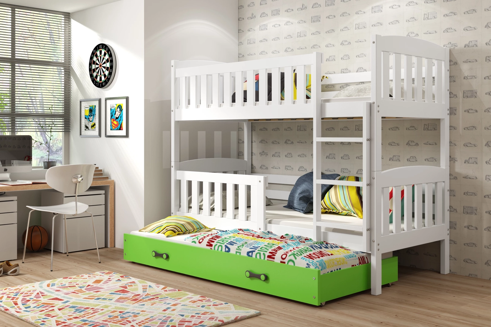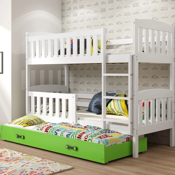 KUBUŚ 90X190 pat triplu pentru tineri cu saltea și sertar, alb/verde