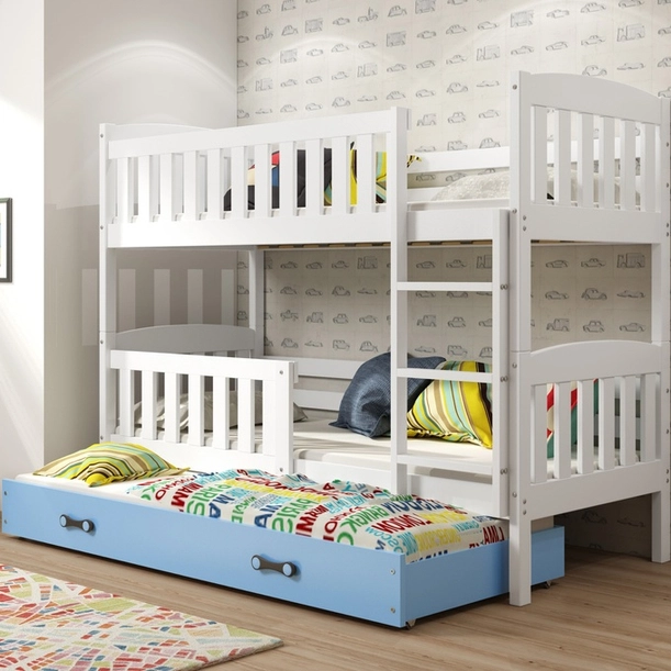 KUBUŚ 90X200 pat de tineret pentru trei persoane cu saltea și sertar, alb/albastru