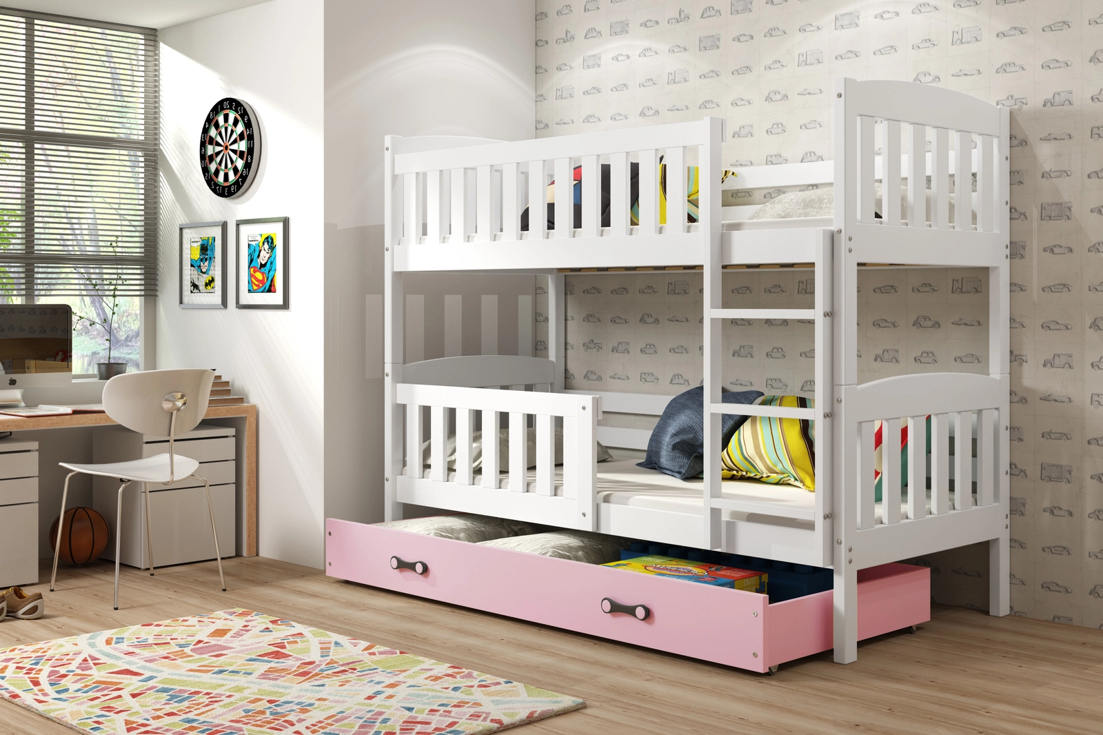 KUBUŚ 90X200 pat de tineret pentru trei persoane cu saltea și sertar, alb/roz