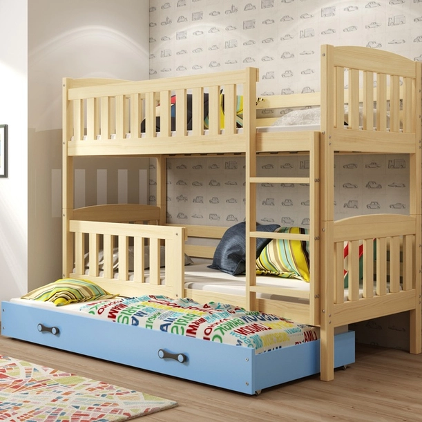 KUBUŚ 90X200 pat de tineret pentru trei persoane cu saltea și sertar, pin/albastru