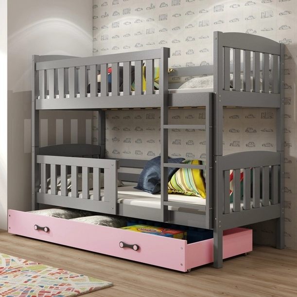 KUBUŚ 90X200 pat supraetajat de tineret cu saltea și sertar, grafit / roz