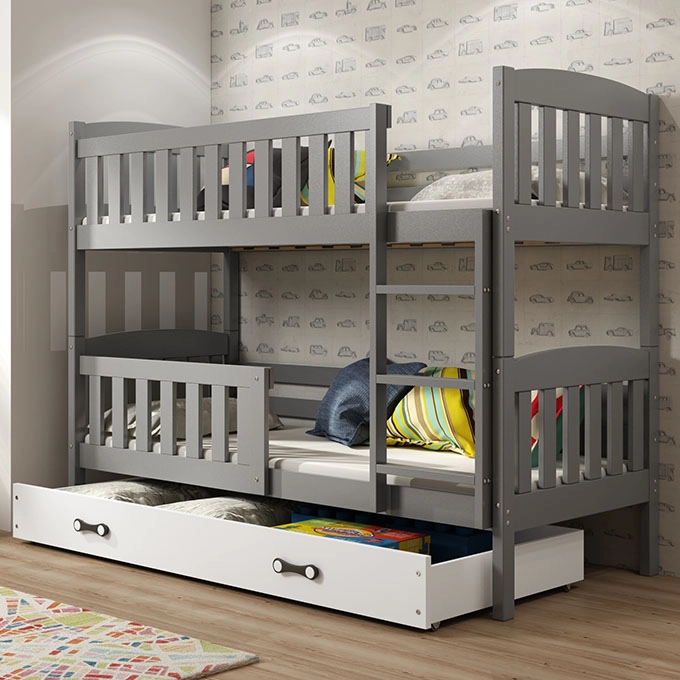 KUBUŚ 90X200 pat supraetajat pentru tineret cu saltea și sertar, grafit/alb