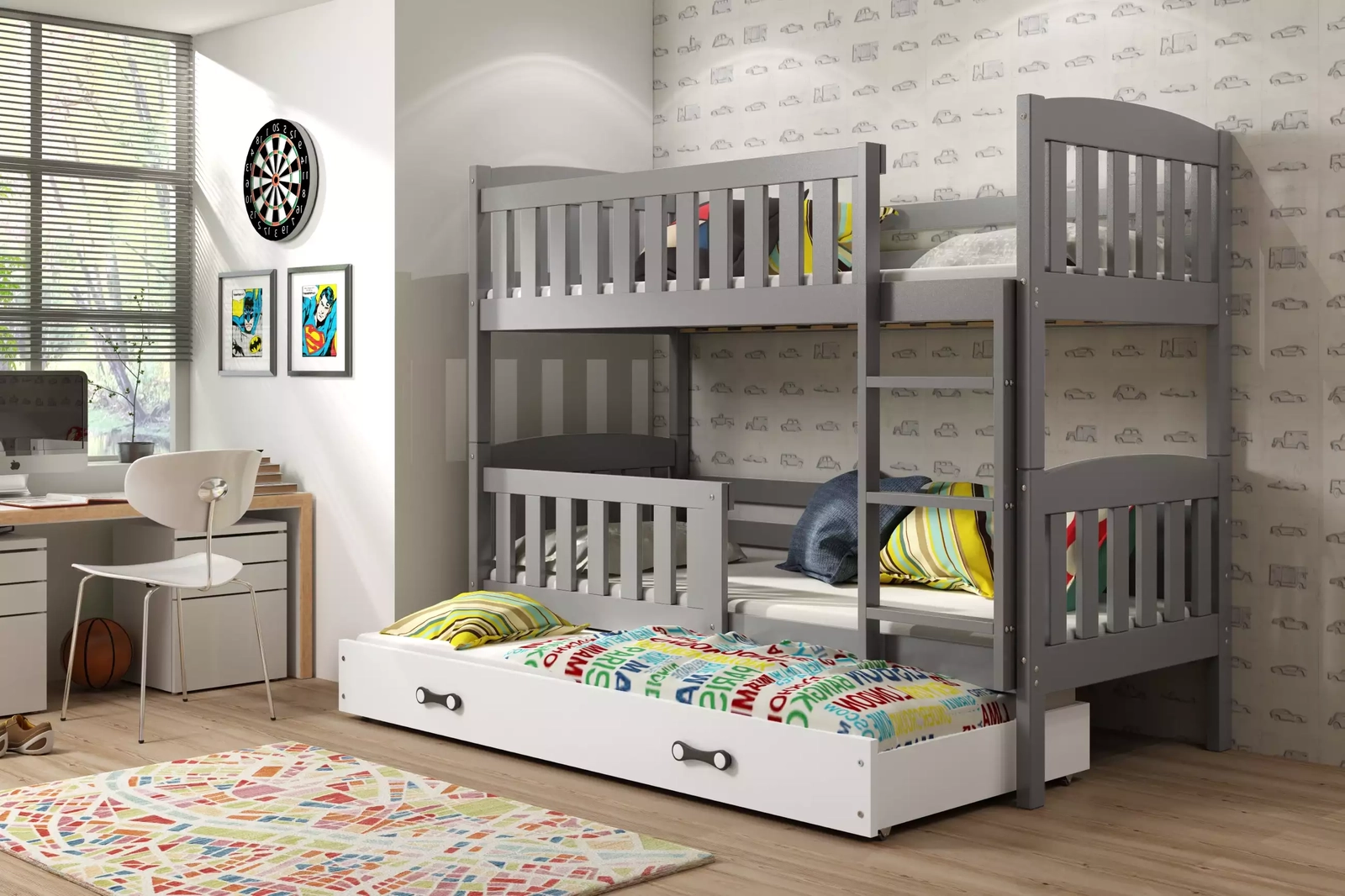 KUBUŚ 90X200 pat triplu pentru tineri cu sertar, grafit/alb