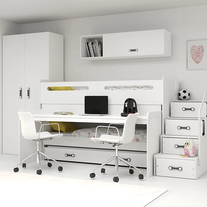 MAX 1 80X200 pat triplu pentru tineri cu saltea și birou, alb
