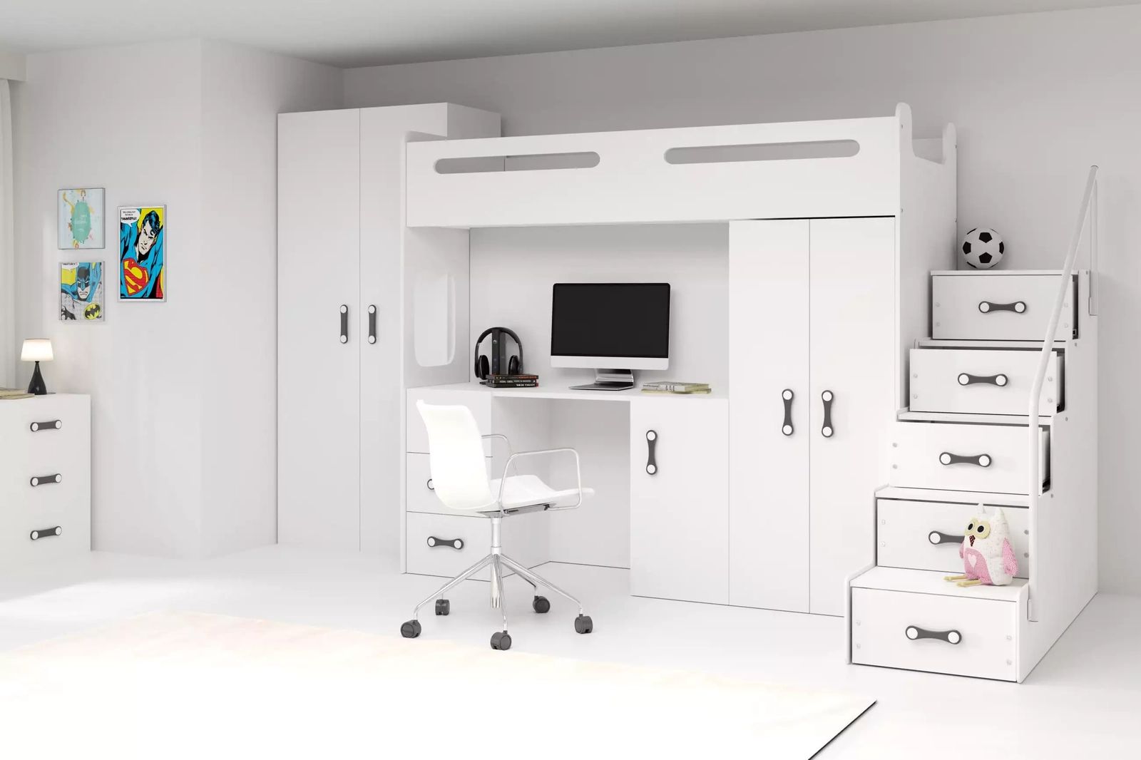 Patul Max 4 îndeplinește toate aceste elemente. Zona de dormit ia forma unui mezanin, sub care se află un birou spațios și un dulap pentru a găzdui toate hainele copilului dumneavoastră. Un alt element practic este scara, care ascunde dulapuri pregătite pentru cărți, jucării și, de asemenea, pentru haine, dacă nu există suficient spațiu pentru acestea în dulapul principal. Patul este încorporat pe toate părțile, ceea ce sporește foarte mult siguranța copilului dumneavoastră, mai ales dacă el sau ea rămâne în mișcare chiar și atunci când doarme - și acest lucru este ceea ce au toate Living Srebels. Patul este cu două fețe.