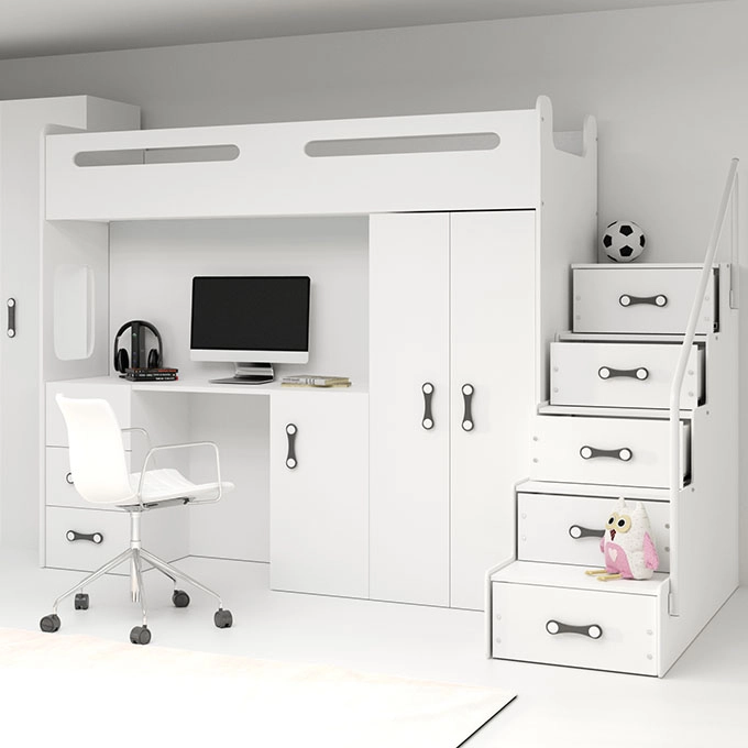 Această piesă versatilă de mobilier alb nu este doar un loc confortabil de dormit, ci și o soluție funcțională pentru camera de tineret. Echipat cu dulapuri și spații de depozitare practice, acesta facilitează organizarea spațiului, în special în camerele mai mici, unde fiecare centimetru este extrem de important. În plus, siguranța este asigurată de balustradă și de marginile rotunjite (raza R2), ceea ce este deosebit de important pentru copiii activi.