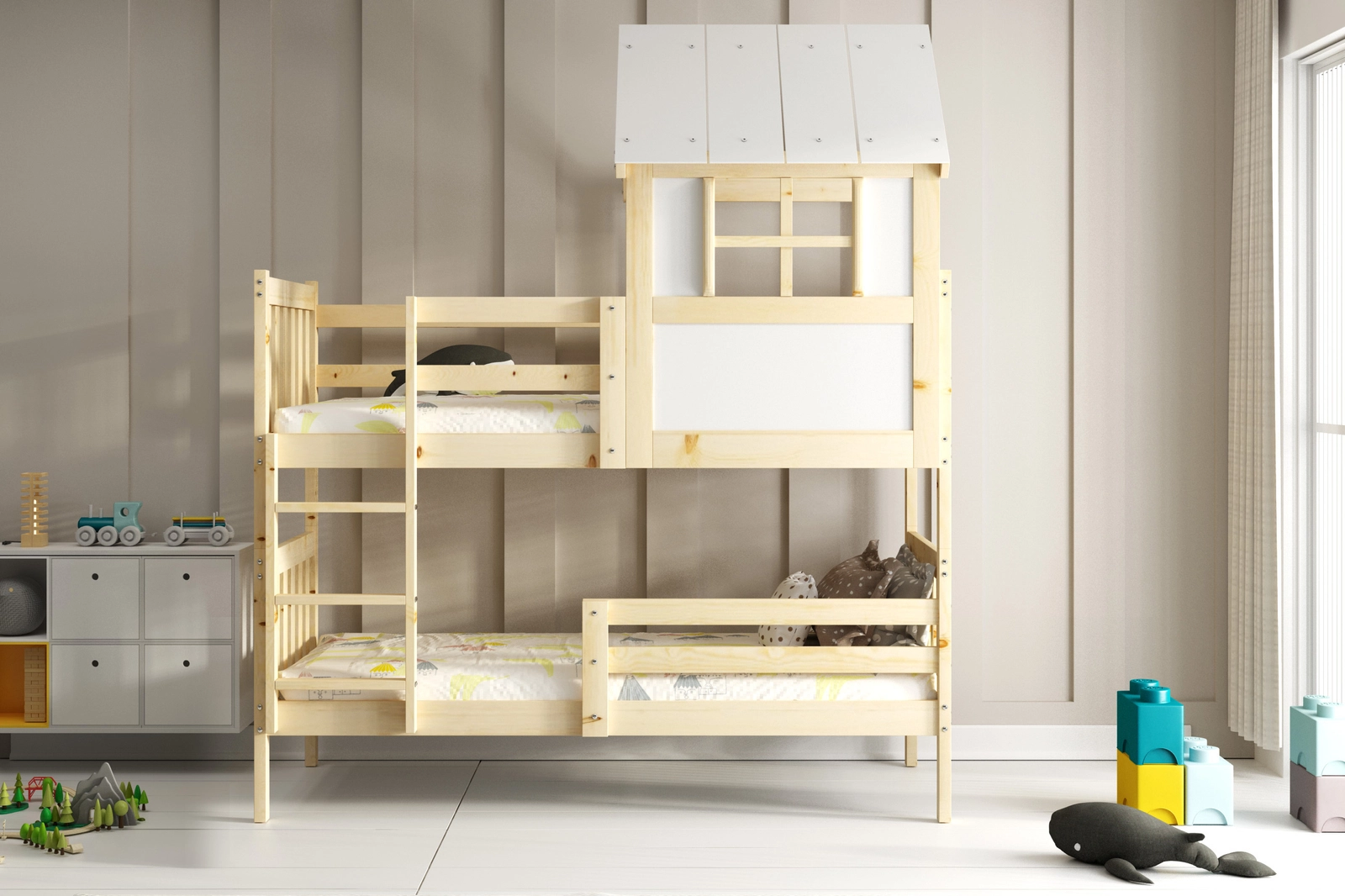 Patul bunkhouse este o propunere unică pentru copii, care combină funcționalitatea, siguranța și designul unic. Fabricat din lemn de înaltă calitate, acesta oferă o nuanță naturală a ramei, care funcționează perfect cu fronturile albe. Acest duo de culori estetice face ca patul să fie punctul culminant al camerei oricărui copil, conferindu-i un aspect confortabil, dar modern.