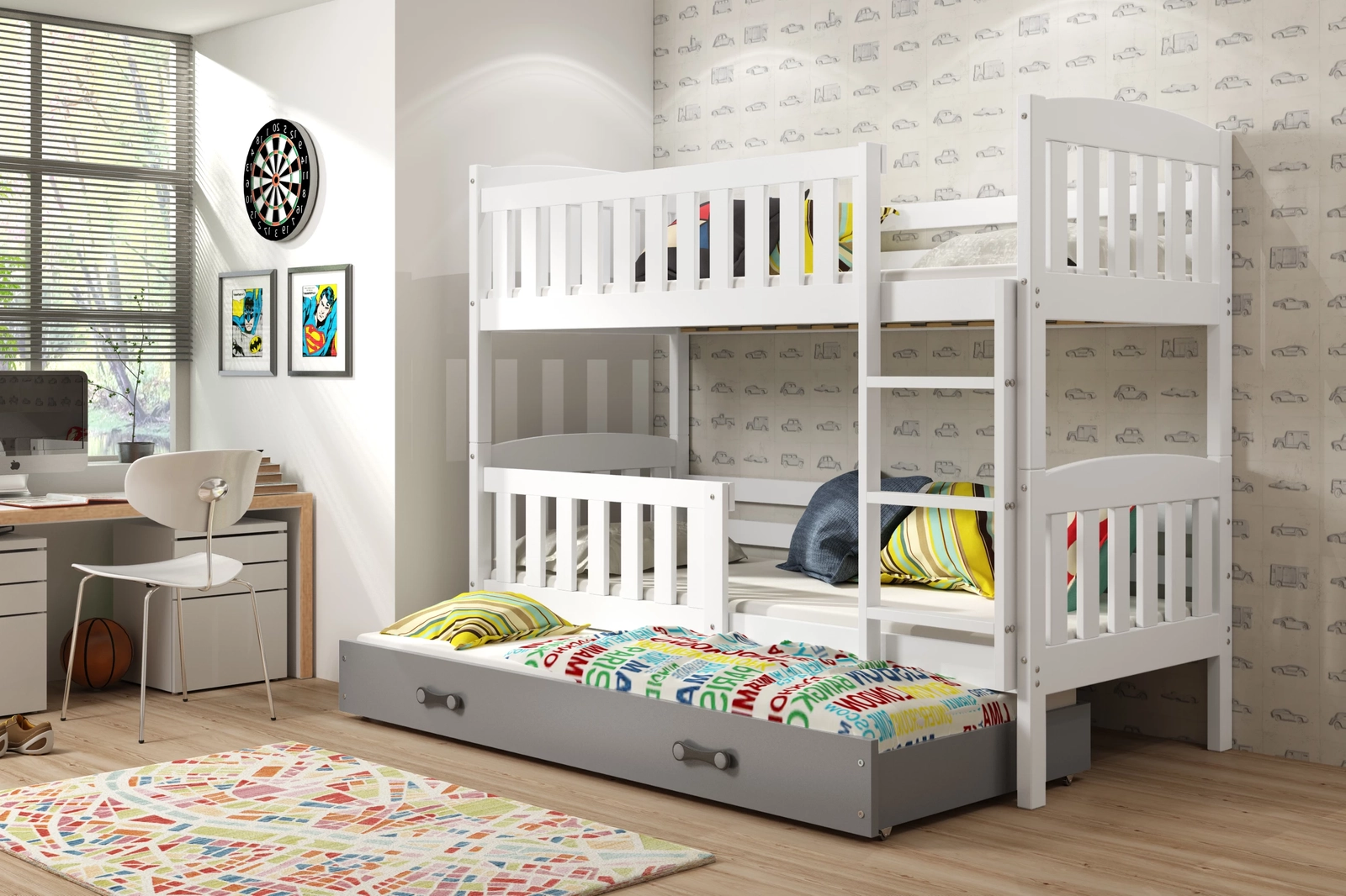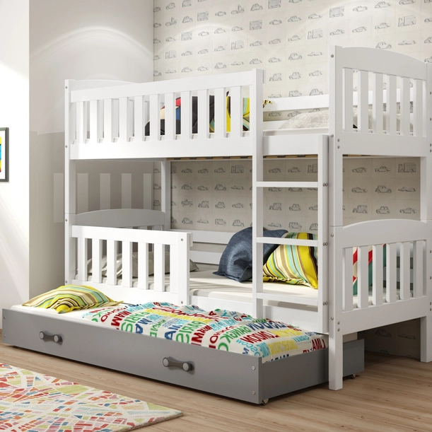 Pat de tineret pentru trei persoane KUBUŚ 90X200 cu saltea și sertar, alb/grafit