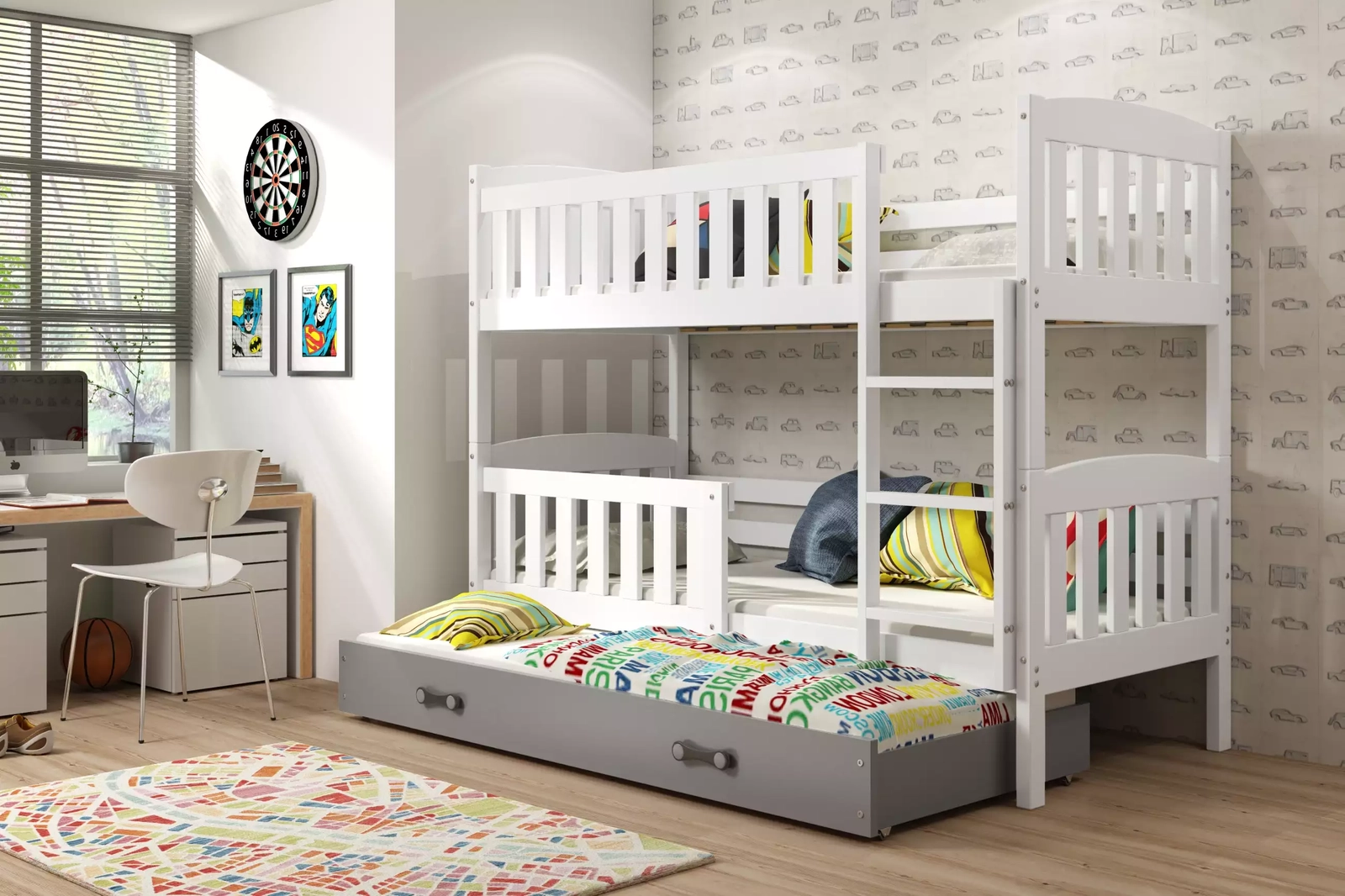 Pat de tineret pentru trei persoane KUBUŚ 90X200 cu sertar, alb/grafit