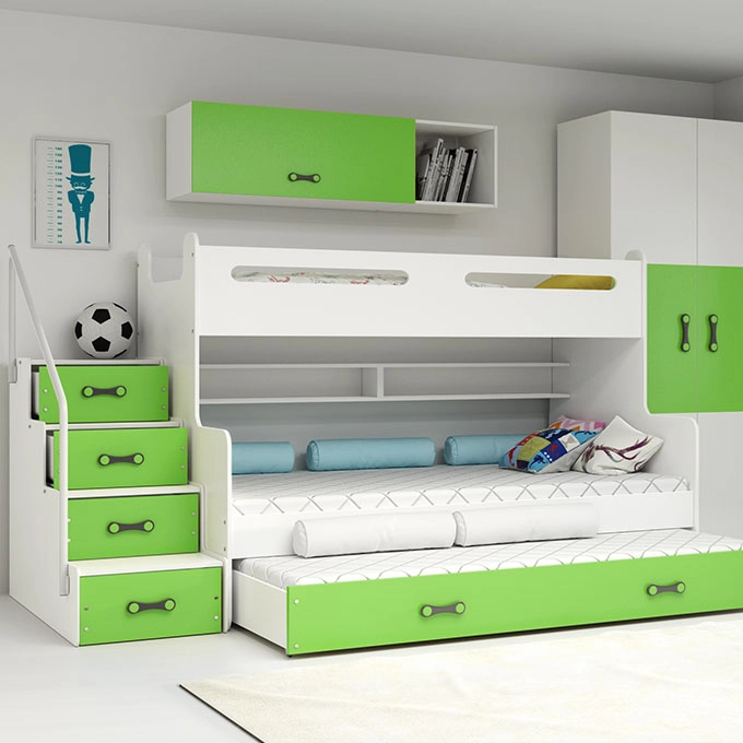 Pat de tineret triplu MAX 3 120X200 cu saltea și sertar, verde