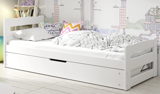 Patul individual Erni este conceput pentru camera fiecărui copil. Construcția din pin este durabilă și întărită cu șuruburi din oțel pentru o rezistență sporită, făcând patul pregătit pentru sarcini de până la 100 kg. Cadrul din scândură de mesteacăn cu arcuri asigură un somn confortabil și oferă suport adecvat pentru coloană. Există un container pentru lenjerie de pat sub cadrul de ridicare cu arcuri, ceea ce facilitează păstrarea curățeniei în cameră. Culoarea albă a ramei merge perfect cu orice aranjament. Acesta formează un întreg coerent cu verde, roz, gri, albastru, maro - am putea continua la nesfârșit. Am realizat acest lucru prin vopsirea suprafeței lemnului cu o vopsea complet sigură și antialergică, făcând produsul sigur chiar și pentru copiii cu piele sensibilă. Culorile neutre se potrivesc atât unei camere de băiat, cât și unei camere de fată. Patul Erni este o soluție confortabilă care va fi o investiție excelentă pentru mulți ani de acum înainte. Datorită dimensiunii sale, 90x200 este ideal pentru adolescenți. Pe de altă parte, atunci când este cumpărat pentru un copil mic, îl va servi timp de mulți ani.