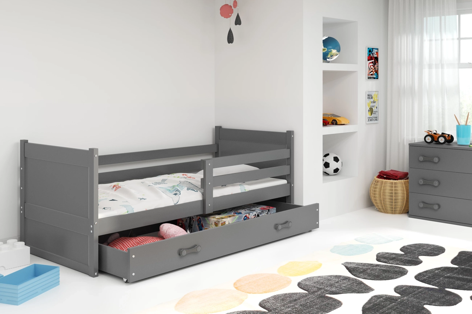 Pat single junior RICO 90X200 cu saltea și sertar, grafit