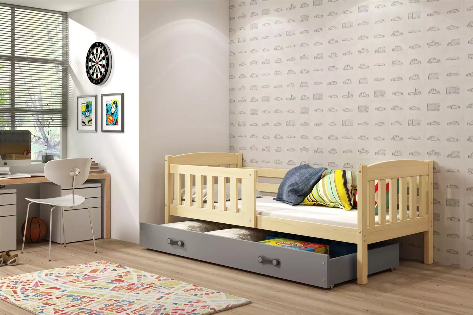 Pat single pentru copii KUBUŚ 80X160 cu saltea și sertar, pin/grafit