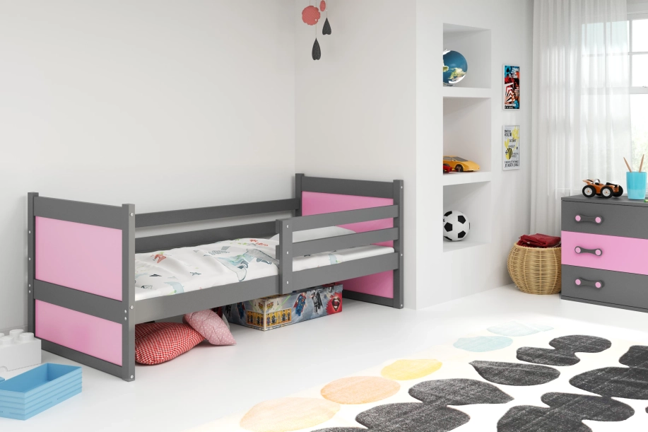 Pat single pentru tineri RICO 90X200 cu saltea, grafit/roz