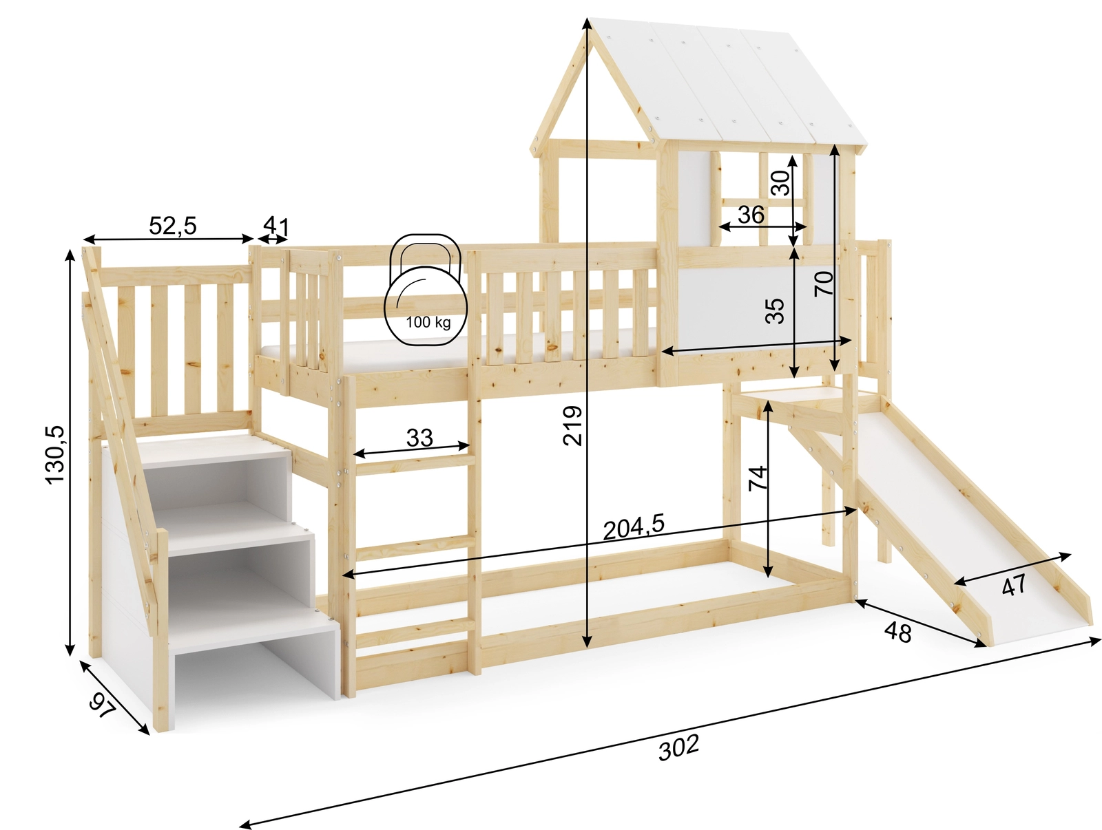 - Patul bunkhouse cu tobogan și scări este soluția ideală pentru copii, combinând distracția și funcționalitatea. Fabricat din lemn în culoare naturală, cu fețe albe. Suprafața de dormit de 90x200 cm oferă un mediu de dormit confortabil.