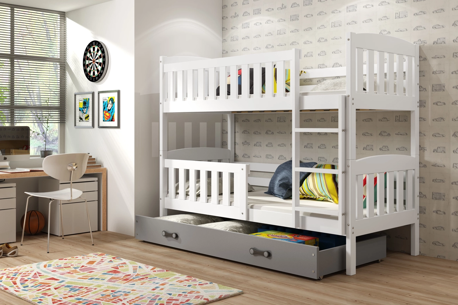 Pat supraetajat junior KUBUŚ 90X190 cu saltea și sertar, alb/grafit