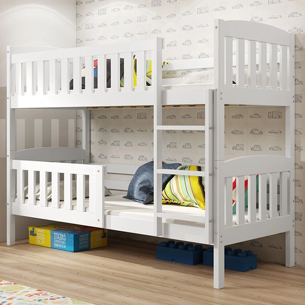 Designul cu etaje face o utilizare optimă a spațiului, lăsând mai mult loc pentru joacă sau învățare. Construcția, realizată din lemn de pin și întărită cu șuruburi din oțel de înaltă calitate, este stabilă și robustă. Acest lucru, la rândul său, înseamnă siguranța copiilor dvs. în timp ce dorm și odihna dvs. liniștită. Posibilitatea de a instala bariere pe ambele niveluri este un omagiu adus celor mai tineri și un rezultat al preocupării pentru ei. Protejează de cădere chiar și cei mai ocupați și mai energici copii. Barierele sunt universale, voi decideți poziția lor în timpul asamblării. Cadrul realizat din scânduri cu arcuri oferă un sprijin excelent pentru coloană.