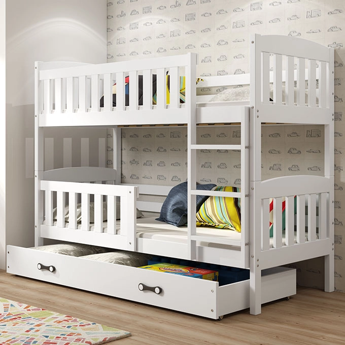 Pat supraetajat junior KUBUŚ 90X200 cu saltea și sertar, alb