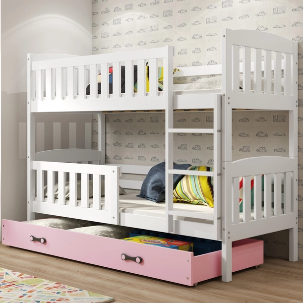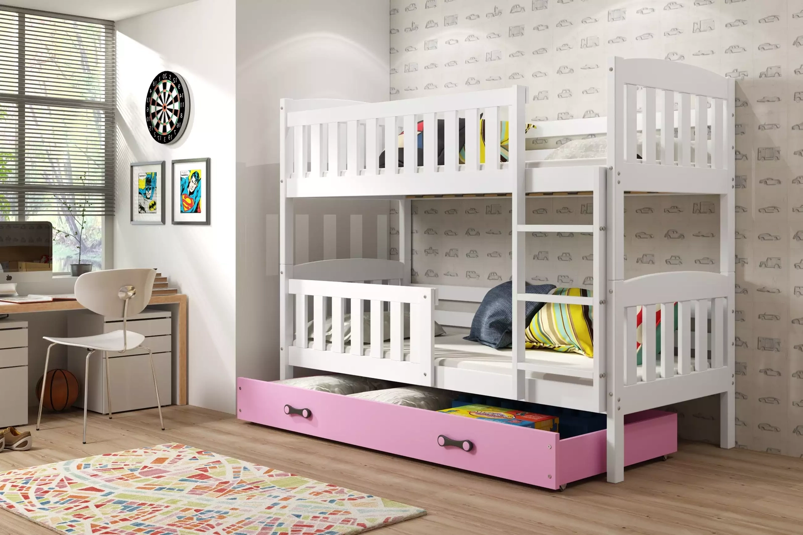 Pat supraetajat junior KUBUŚ 90X200 cu saltea și sertar, alb/roz