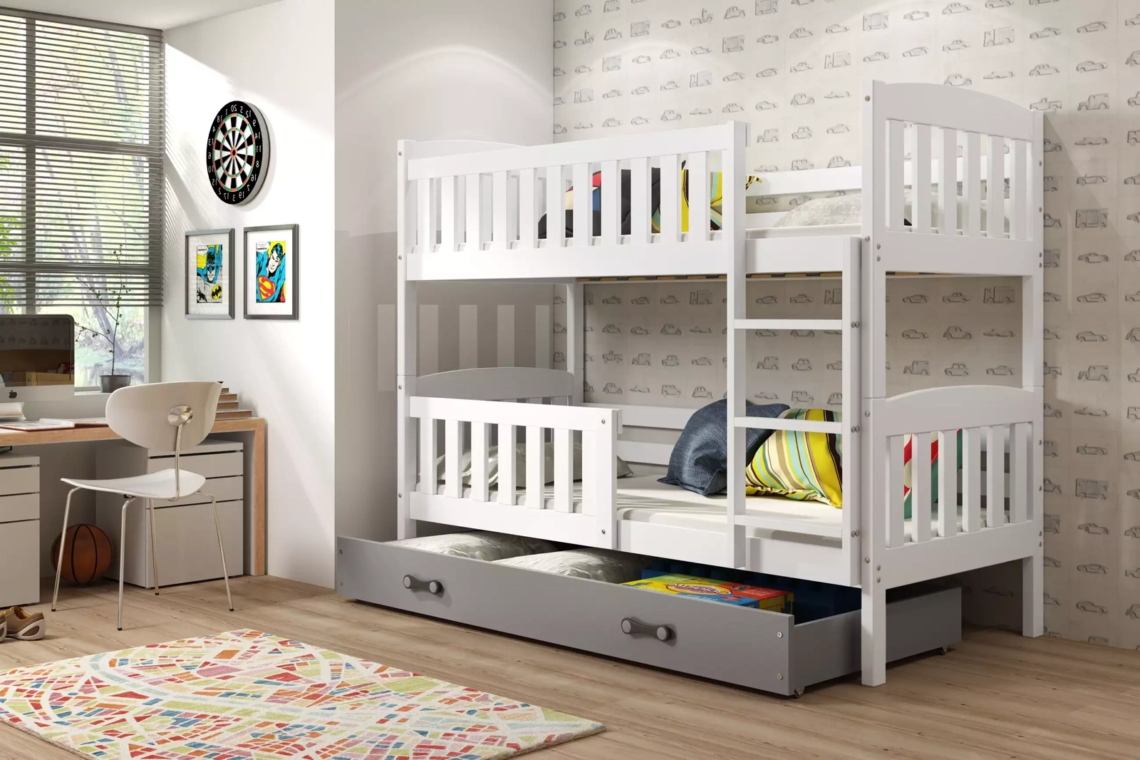 Pat supraetajat junior KUBUŚ 90X200 cu sertar, alb/grafit