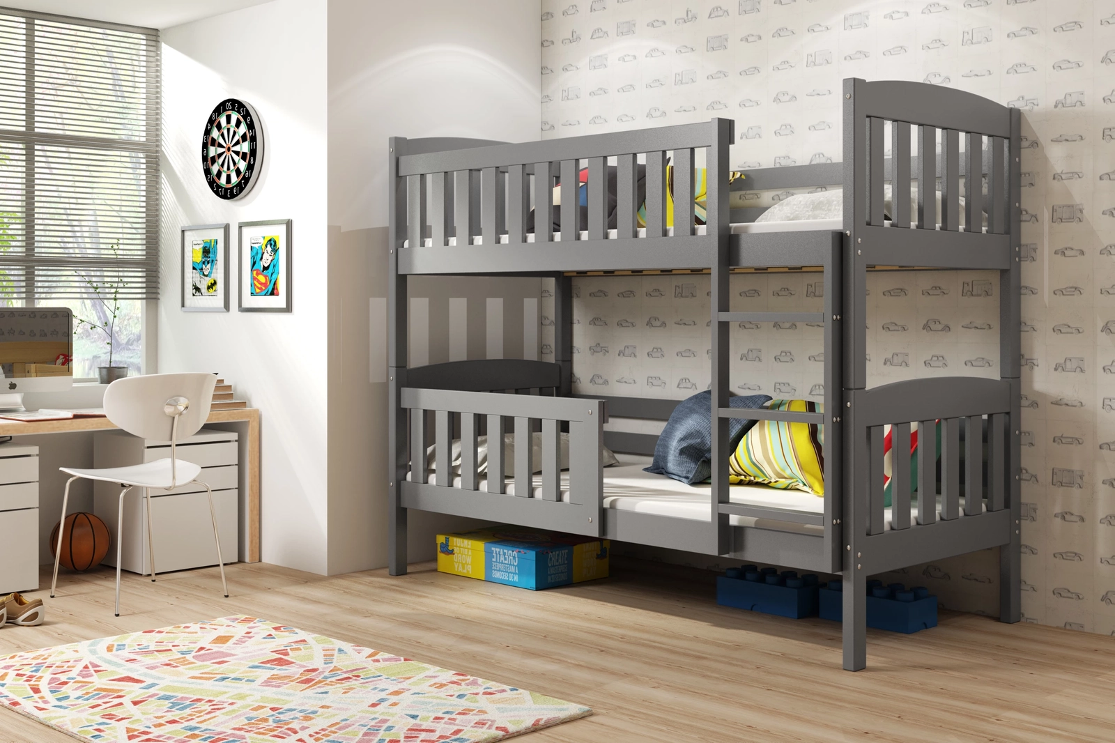 Culoarea grafit a fost obținută prin vopsirea suprafeței lemnului cu o vopsea complet sigură și antialergică, ceea ce face ca produsul să fie sigur chiar și pentru copiii cu piele sensibilă. Schema de culori neutre se potrivește atât unei camere de băiat, cât și unei camere de fată, permițându-vă să evitați discuțiile stânjenitoare cu cei mici.