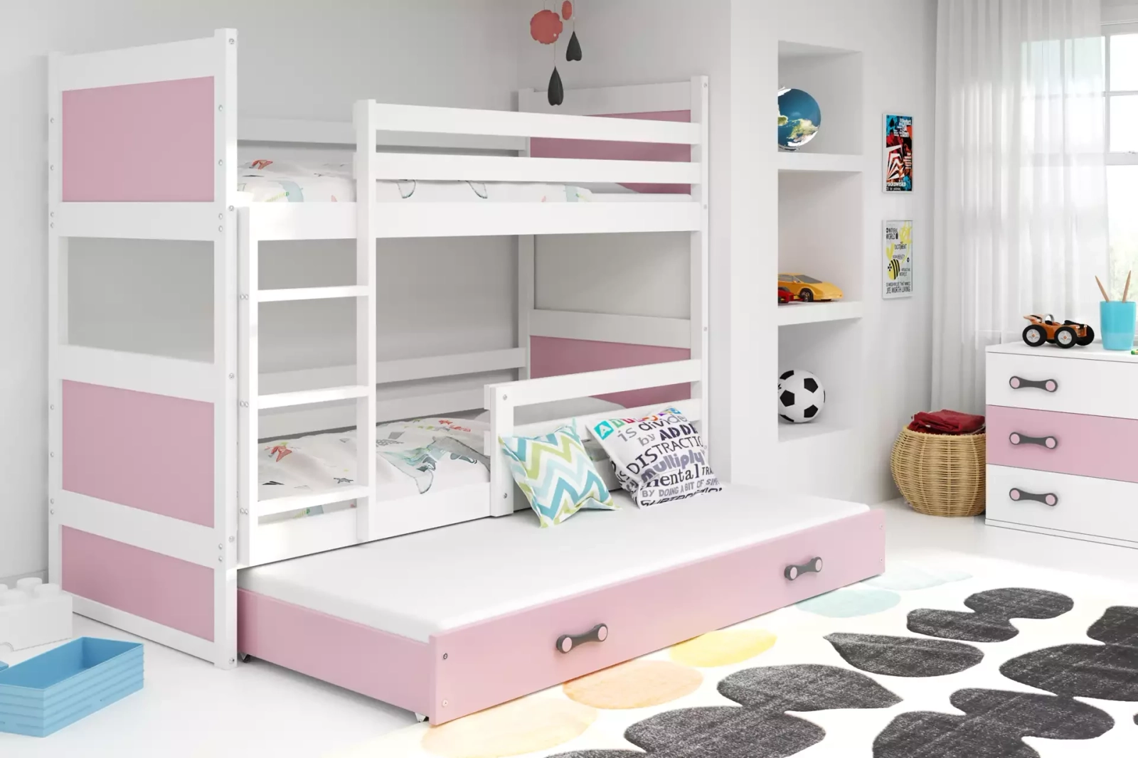 PAT SUPRAETAJAT PENTRU ADOLESCENȚI CU 3 LOCURI RICO CADRU ALB PANOURI ROZ SERTAR ROZ 90 X 190