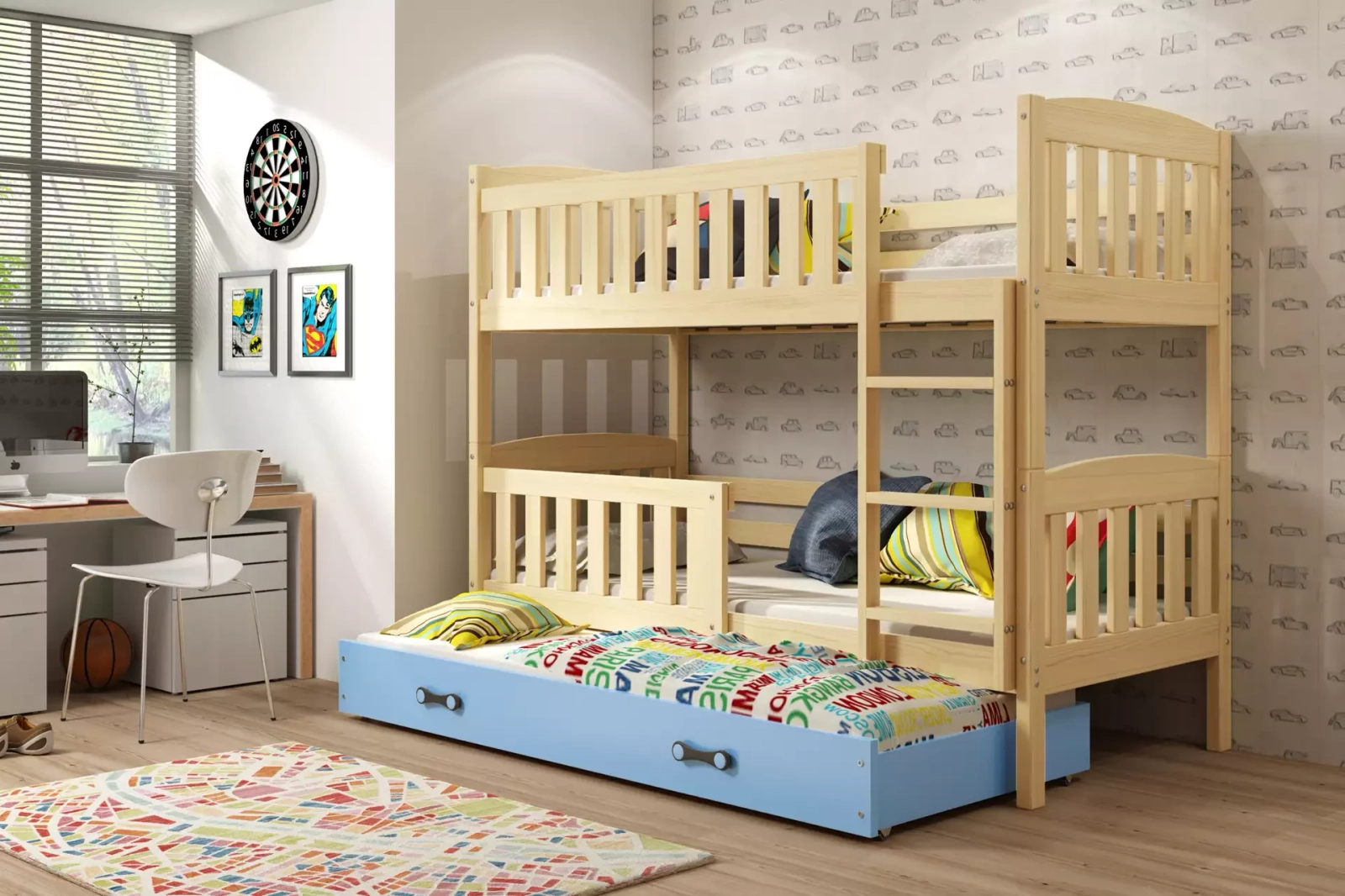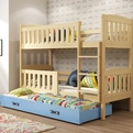 Pat supraetajat pentru adolescenți Jacquot cu 3 locuri 90x190 cu saltea și sertar, pin/albastru