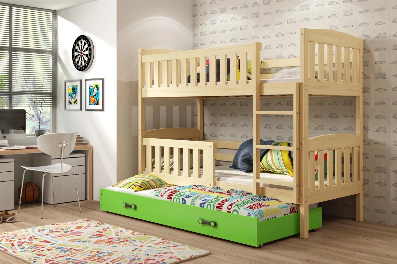 Pat supraetajat pentru adolescenți Jacquot cu 3 locuri 90x190 cu saltea și sertar, pin/verde