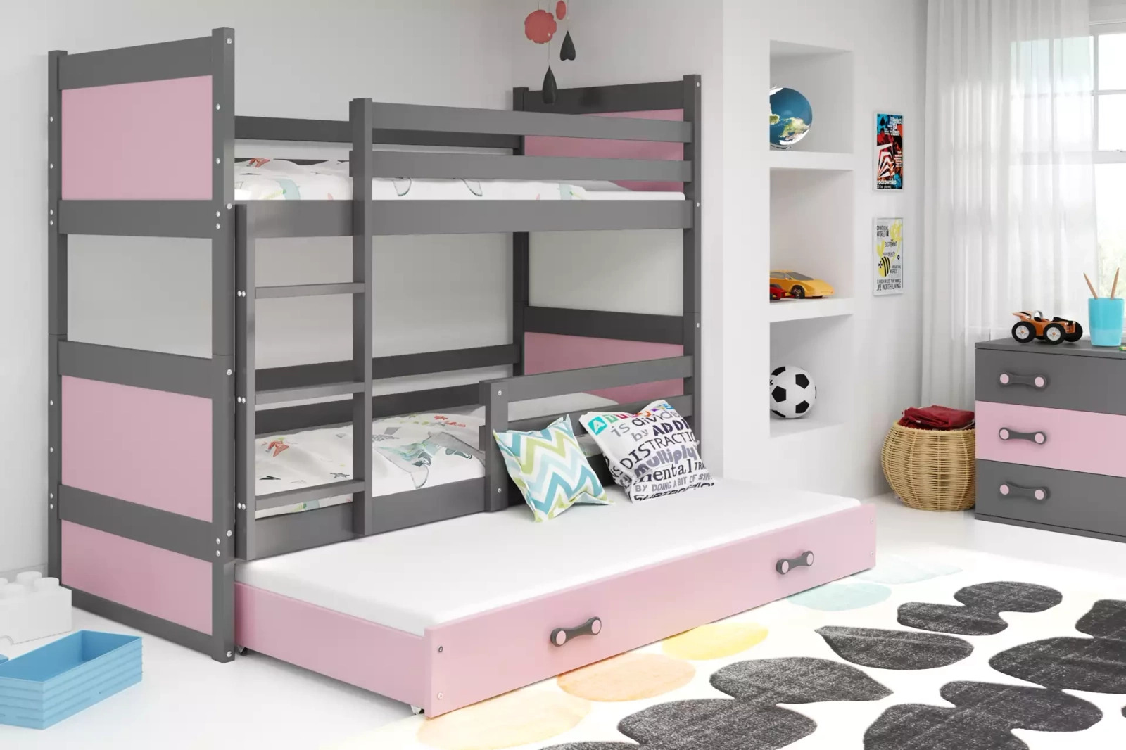 Pat supraetajat pentru adolescenți Rico cu 3 locuri 90x190 cu saltea și sertar, gri/roz