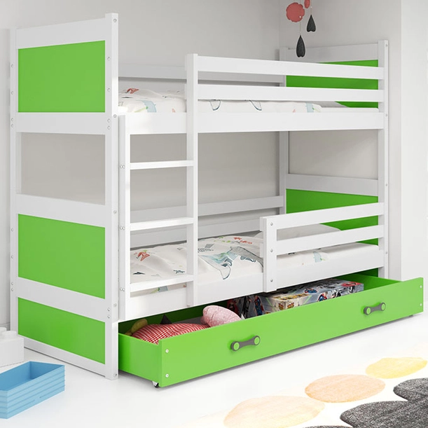 Pat supraetajat pentru tineri RICO 90X200 cu sertar, alb/verde