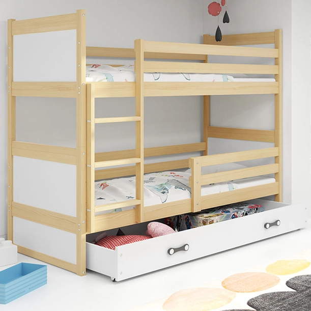 Pat supraetajat pentru tineri RICO 90X200 cu sertar, pin/alb