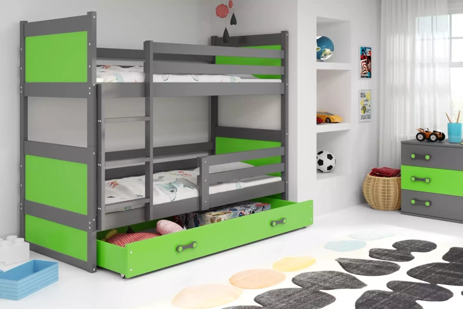 Pat supraetajat Rico 90x190 cu sertar, gri/verde