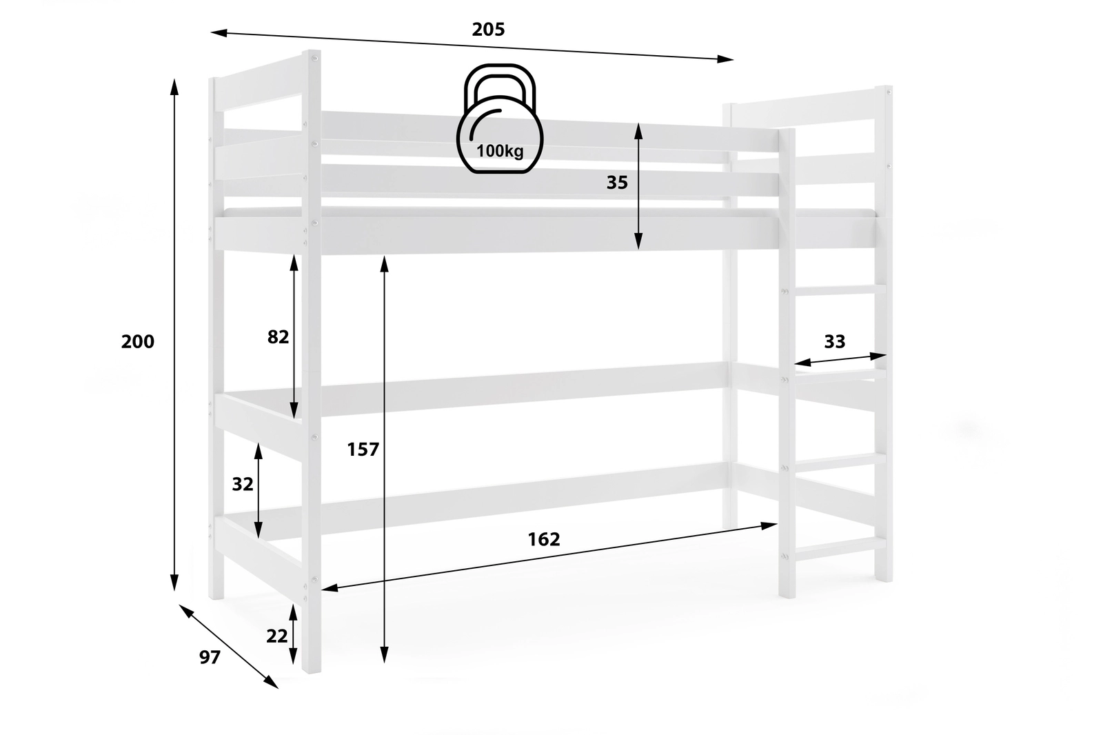Un pat supraetajat pentru tineri este alegerea perfectă pentru orice copil care dorește nu numai un loc pentru a dormi în camera lor, ci și un element de design interesant în interior. Modelul prezentat este fabricat din lemn de înaltă calitate, care garantează durabilitatea și robustețea construcției. Cu o suprafață de dormit de 90x200 cm, patul asigură un somn confortabil chiar și pentru copiii mai mari, oferind un spațiu de care fiecare copil se va bucura.