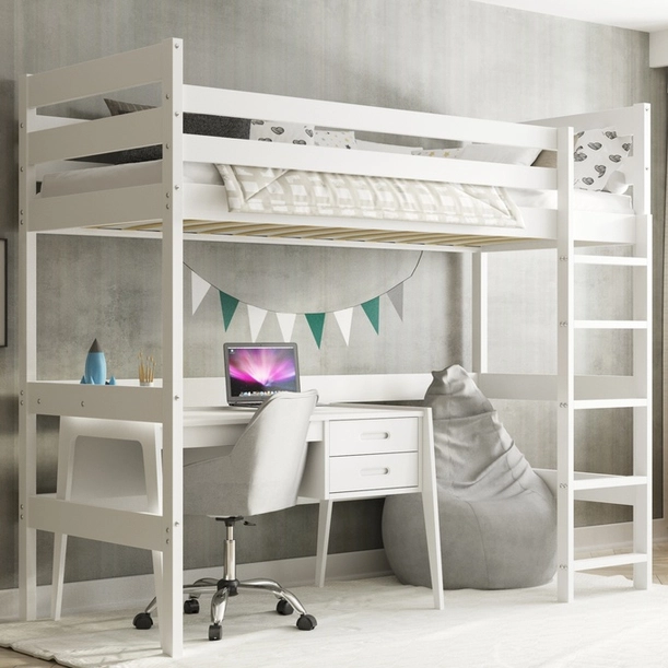 - Un pat supraetajat pentru tineri cu o suprafață de dormit de 90x200 cm este soluția ideală pentru cei care economisesc spațiu. Fabricat din lemn, acesta este caracterizat de rama sa albă, care se integrează perfect în decorul oricărei camere. Nu include s