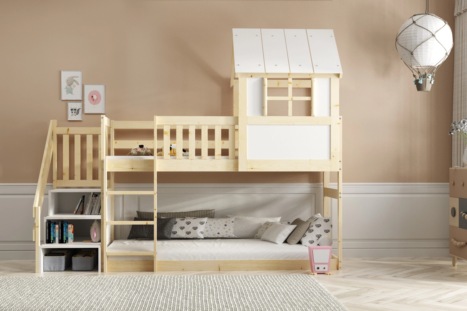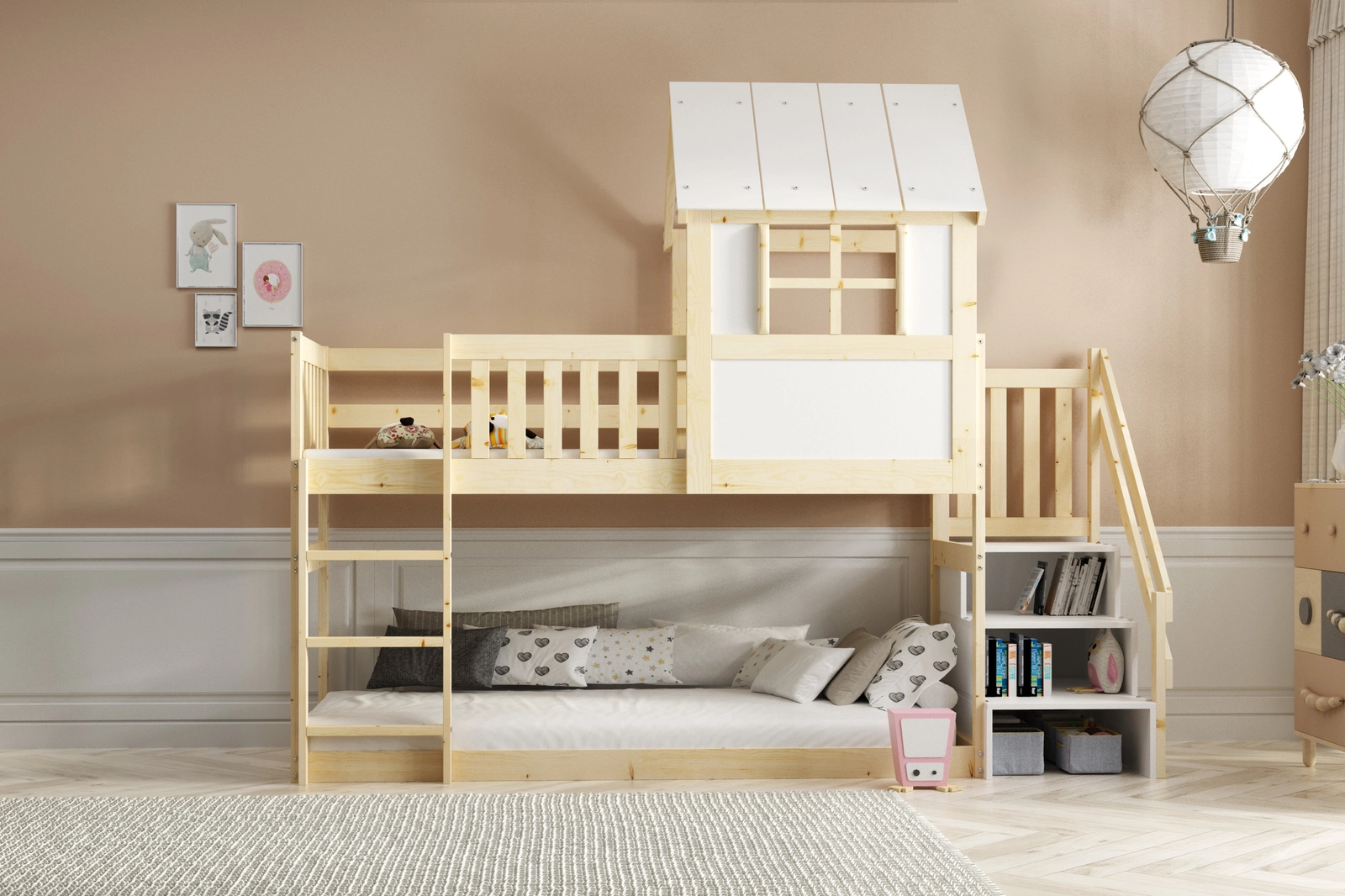 - Scări la pat - intrare confortabilă pentru copil, spațiu suplimentar de depozitare.