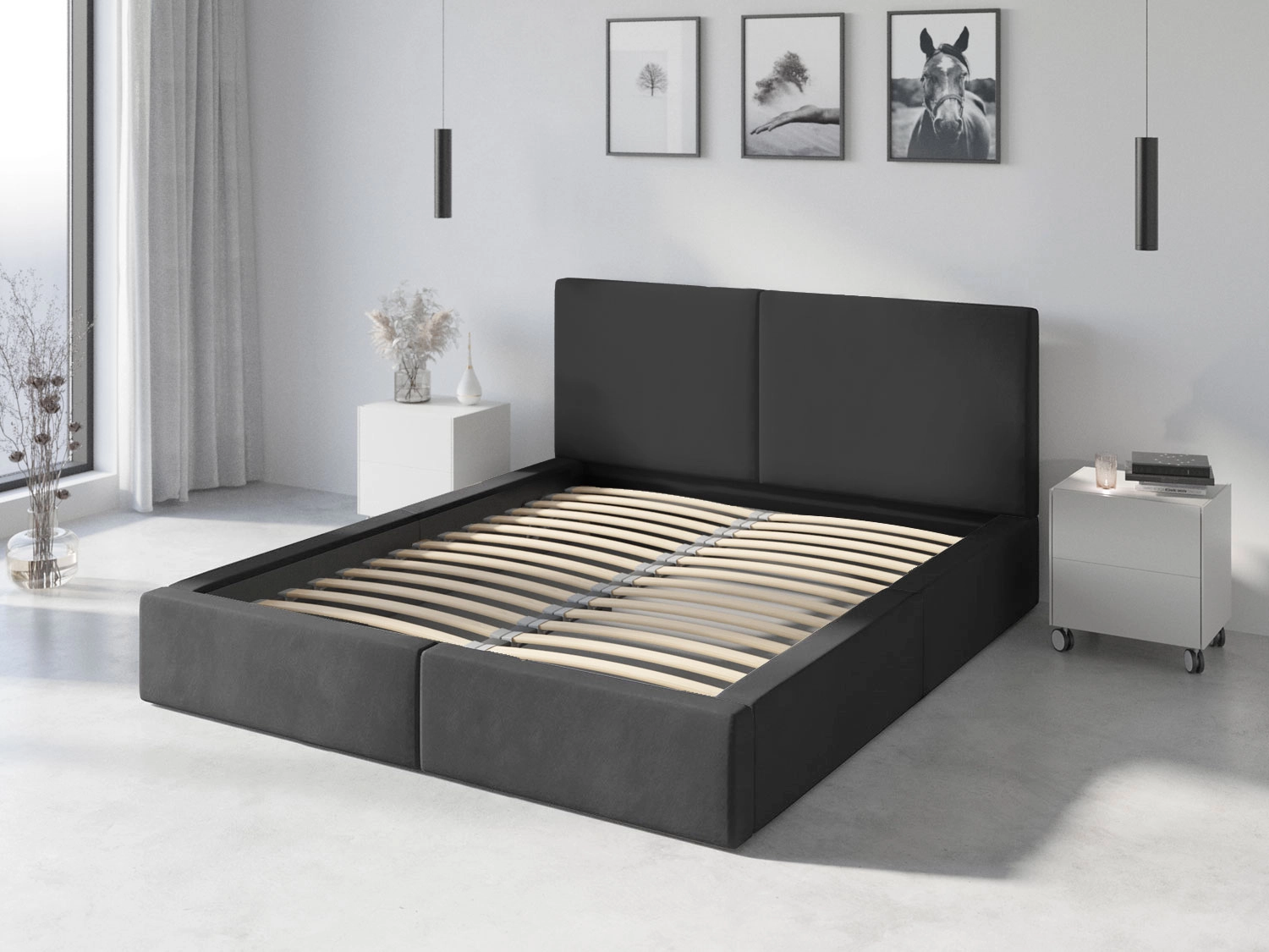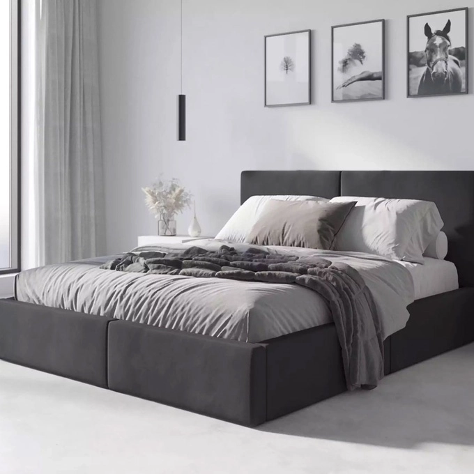 - Pat tapițat grafit 160x200 este o piesă elegantă pentru orice dormitor. Construcția robustă din lemn și un cadru confortabil garantează un somn confortabil. Sistemul simplu de asamblare îl face ușor de asamblat. Patul nu are ladă de depozitare.