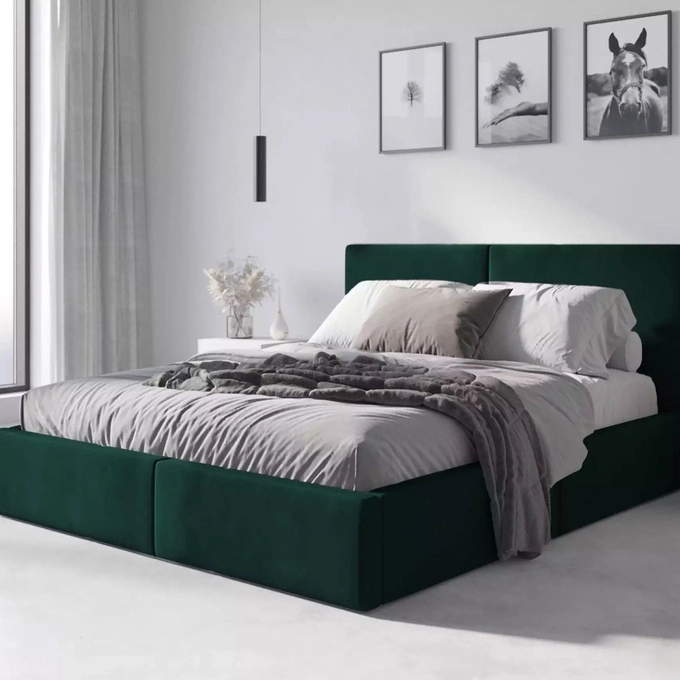 Pat tapițat 160x200 este o propunere pentru cei care apreciază confortul și eleganța. Tapițeria verde moale și tactilă conferă interiorului o senzație liniștitoare, naturală, în timp ce cusăturile atente accentuează liniile moderne ale mobilierului. Tetiera înaltă și confortabilă oferă sprijin confortabil atunci când citiți sau vă relaxați, creând o zonă confortabilă de relaxare zilnică.