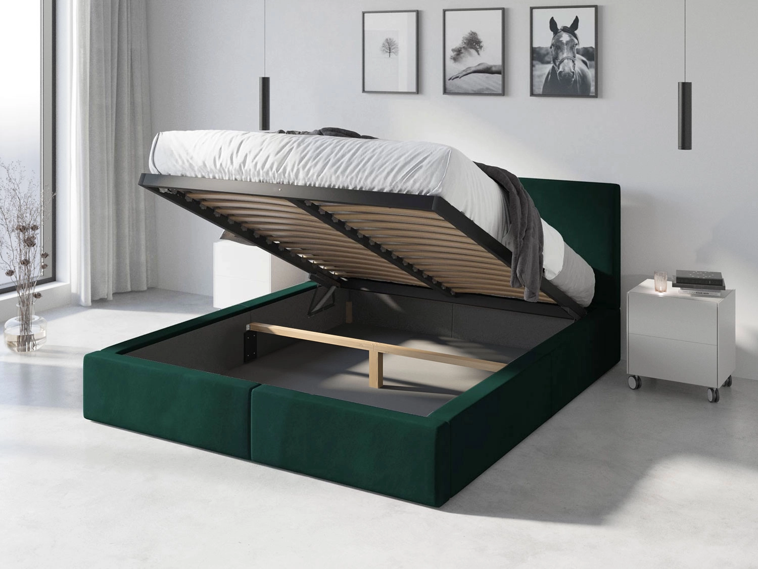 Pat tapițat pentru dormitor HILTON 120X200 cu saltea și container, verde